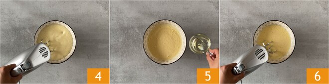 Incorpore sempre com as batedeiras elétricas 4. Adicione o óleo de sementes em fio e continue batendo 5 6.
