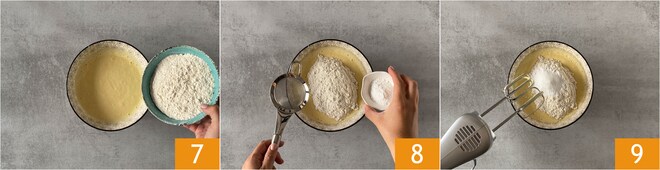 Você pode adicionar a farinha 7 e o fermento peneirado 8, incorporando sempre com as batedeiras 9.