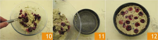 Agora, com a espátula, adicione as cerejas e misture com movimentos circulares 11. Unte e polvilhe com açúcar uma forma de aro removível de 18 cm. Despeje a massa na forma 11, distribuindo de maneira uniforme com uma espátula ou as costas de uma colher 12.