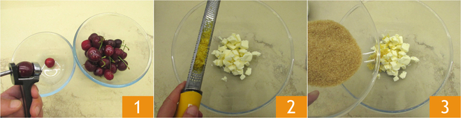 Para preparar o bolo de trigo sarraceno com damascos e cerejas, retire os caroços das cerejas 1 e corte-as ao meio. Numa tigela, coloque a manteiga pomada com raspas de limão 2, uma pitada de sal e 150 g de açúcar mascavo 3.
