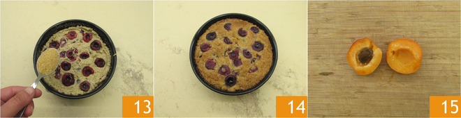 Polvilhe levemente a superfície com um pouco de açúcar mascavo 13. Coloque em forno estático pré-aquecido a 160° por cerca de 55-60 minutos, faça o teste do palito no centro para verificar o cozimento 14. Corte os damascos ao meio, retire o caroço 15.
