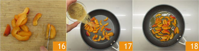 Depois, corte-os em fatias pequenas 16. Doure-os em uma frigideira com 50 g de açúcar mascavo em fogo alto 17: assim que estiverem uniformemente cobertos de caramelo, retire do fogo 18, antes que comecem a liberar muito líquido e percam a consistência. Isso levará 2-3 minutos.