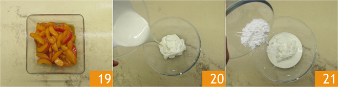 Reserve os damascos caramelizados 19. Em uma tigela, coloque o creme de leite, o iogurte grego 20 e o açúcar de confeiteiro 21.