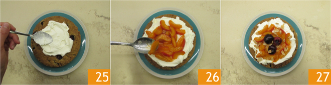 Uma vez pronto o bolo, deixe esfriar completamente antes de desenformar e cobrir com o creme de iogurte 25 e os damascos caramelizados 26. Complete com algumas cerejas e lâminas de amêndoas torradas. O Bolo de trigo sarraceno com cerejas e damascos está pronto para ser servido 27.
