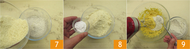 Em uma tigela, misture a farinha de trigo sarraceno, a farinha de amêndoas 7 e o fermento peneirado 8, incorpore bem os pós com o batedor, uma colher de cada vez 9.