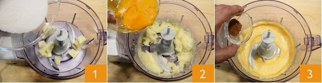 Para preparar o bolo de vinho tinto, corte a manteiga em temperatura ambiente em cubos e coloque-a em um processador de alimentos com lâminas; adicione o açúcar 1 e misture tudo até obter um creme. Separe as gemas das claras (guarde as claras, pois serão usadas posteriormente) e adicione aos poucos as gemas à mistura 2; misture bem, em seguida, adicione a canela e cravos em pó 3.