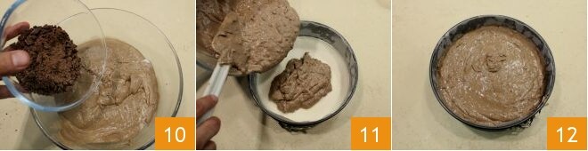 E adicione-o à massa que você obteve 10. Unte e forre com papel manteiga uma forma de 22 cm de diâmetro e despeje a massa 11, nivelando bem com a espátula 12.