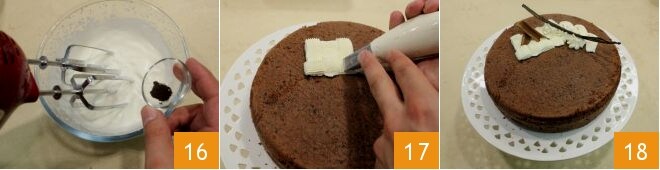 Adicione as sementes de baunilha e continue batendo 16. Quando o creme estiver pronto, coloque o bolo de vinho tinto, que já estará frio, em um prato de servir ou em um suporte; finalmente, com um saco de confeitar com bico frisado, decore-o com o creme que você preparou 17 e, por fim, sirva 18. Para um toque final mais sofisticado, você pode adicionar à decoração uma fava de baunilha inteira e um par de paus de canela.