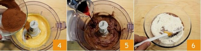Adicione também o cacau em pó 4 e depois o vinho tinto 5. Misture até obter um creme de cor uniforme e, neste ponto, transfira a massa para uma tigela; adicione a farinha peneirada misturada com o fermento e misture bem com uma espátula para evitar a formação de grumos 6.