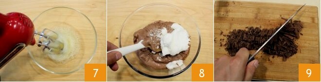 Em um recipiente, bata as claras que você reservou anteriormente até ficarem em neve com uma batedeira elétrica 7; quando as claras estiverem em neve, com a espátula, incorpore-as delicadamente à massa em três etapas 8, misturando de baixo para cima para evitar que a mistura desmorone. Em seguida, com uma faca, pique o chocolate amargo bem fininho 9,
