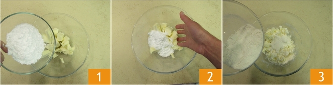 Para preparar o bolo delicioso com mousse de chocolate, comece preparando o crumble. Em uma tigela, coloque a manteiga macia, adicione o açúcar de confeiteiro 1 e comece a amassar com as mãos 2. Em seguida, adicione a farinha 3.