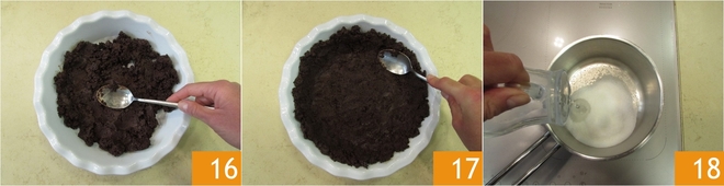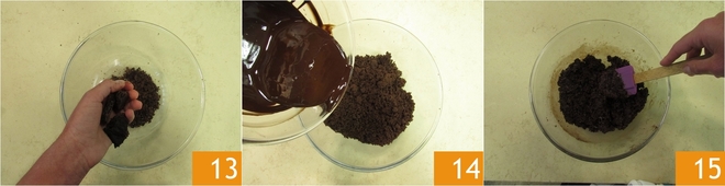 Esmigalhe o crumble em uma tigela 13, adicione a mistura de óleo e chocolate 14 e misture com uma espátula 15.