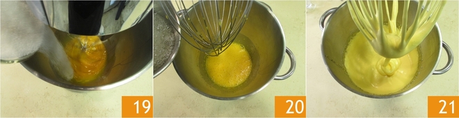 Enquanto a calda está chegando ao ponto de ebulição, quebre os ovos na tigela de uma batedeira equipada com o batedor e comece a bater. Após cerca de um minuto, adicione os 100 g de açúcar restantes 19 e, assim que a calda atingir 121ºC, despeje-a em fio, trabalhando em velocidade média-alta. Deixe escorrer ao longo das paredes da tigela 20. Continue batendo até que a mistura esteja à temperatura ambiente 21. Isso levará cerca de 5 minutos.