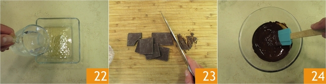 Enquanto isso, coloque a gelatina de molho em água fria 22. Pique grosseiramente o chocolate 23 e derreta no micro-ondas ou em banho-maria 24.