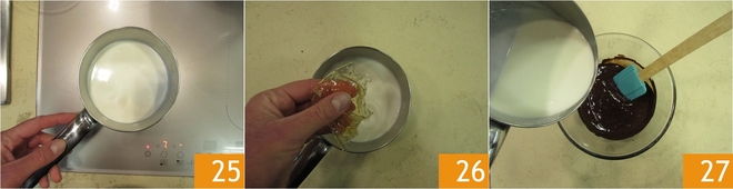 Aqueça o creme de leite em uma panela 25 e, assim que atingir o ponto de ebulição, adicione a gelatina escorrida 26. Misture bem para dissolver 26, então adicione à mistura em 3 adições 27.