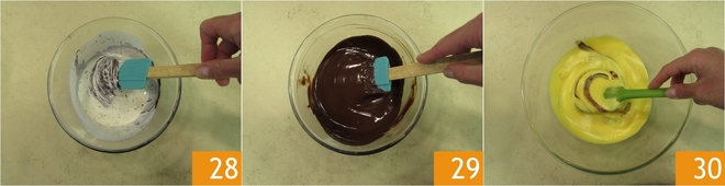 Misture com uma espátula após adicionar um pouco de creme 28 até obter uma ganache fluida e brilhante 29. Deixe esfriar um pouco a ganache, depois adicione a montagem de ovos, também em 3 vezes 30.