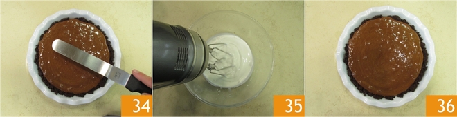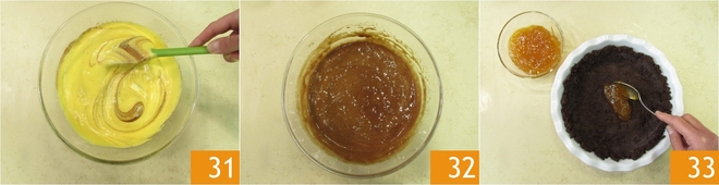 Misture delicadamente de baixo para cima 31, até incorporar tudo. A mousse está pronta 32. Retire a base da geladeira e espalhe no fundo a geleia de damasco, previamente peneirada 33.