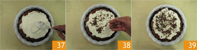 Com uma colher, espalhe o creme sobre a mousse 37 e decore com o chocolate amargo picado 38. O bolo delicioso com mousse de chocolate está pronto para ser servido 39.