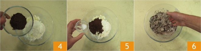 Adicione também o cacau 4 e uma pitada de sal 5. Amasse novamente com as mãos 6.