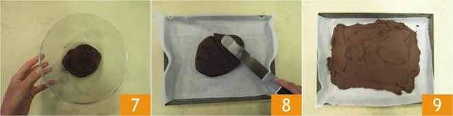 Você deve obter uma massa homogênea, mas macia 7. Transfira para uma assadeira previamente forrada com papel manteiga e, usando uma espátula, alise 8 até obter uma espessura de 1 cm 9.