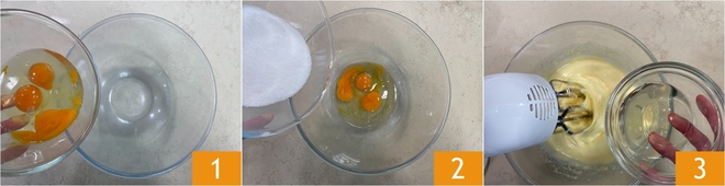 Para preparar o ciambellone sem lactose, comece quebrando os ovos em uma tigela 1, em seguida adicione o açúcar 2 e bata tudo com as batedeiras elétricas até obter uma mistura clara e espumosa. Neste ponto, despeje o óleo de sementes em fio, continuando a bater 3.