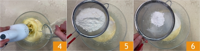 Adicione também o leite de soja, mantendo as batedeiras em ação 4. Peneire a farinha diretamente na tigela 5 e depois o fermento 6, incorporando-os aos poucos enquanto continua a mexer até obter uma massa lisa e sem grumos.