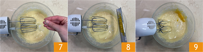 Junte uma pitada de sal 7 e aromatize com a casca ralada de limão 8. Misture mais um pouco 9.