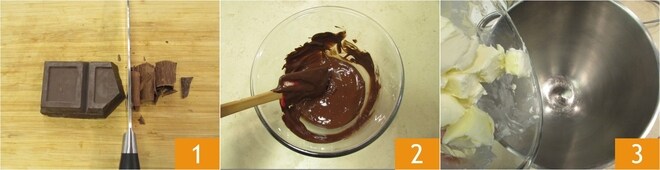 Para preparar o bolo fantasma, primeiro pique o chocolate amargo 1 e derreta em banho-maria ou no micro-ondas 2 e deixe esfriar. Enquanto isso, coloque na tigela da batedeira o manteiga amolecida 3.