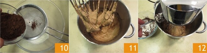 Peneire também o cacau 10. Retome a massa que está bem misturada 11 e incorpore os pós 12.
