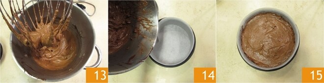 Você deve obter uma massa lisa e homogênea 13. Despeje a massa em uma forma de 20 cm de diâmetro forrada com papel manteiga 14 (como alternativa, você pode untá-la e enfarinhá-la). Nivele a superfície e asse em forno estático pré-aquecido a 180° por cerca de 50 minutos 15.
