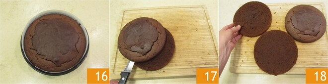 Após esse tempo, verifique o cozimento com um palito, depois desenforme e deixe esfriar 16 antes de remover o bolo da forma. Quando frio, corte o bolo em 3 discos 17 18.