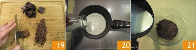 Enquanto isso, prepare a ganache de chocolate. Pique o chocolate amargo 19 e coloque no fogo uma panela com o creme de leite 20. Quando o creme de leite estiver quase fervendo, despeje-o sobre o chocolate picado 21.