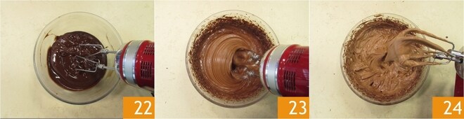 Misture com a batedeira para dissolvê-lo completamente 22. Uma vez que o chocolate esteja derretido, transfira a mistura para uma tigela contendo gelo e continue a trabalhar com um batedor elétrico 23 até que esteja bem batida 24.