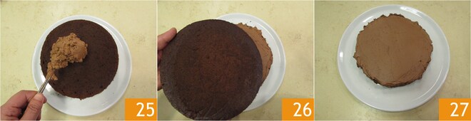 Agora, com uma espátula, espalhe a ganache no primeiro disco 25, coloque o segundo disco 26 e pressione para que adira bem. Complete com o terceiro disco e recheie também a superfície com a ganache 27, distribuindo-a com uma espátula. Transfira o bolo para o refrigerador, apenas o tempo para preparar os fantasminhas.