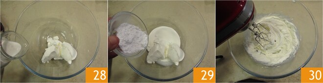 Em uma tigela, trabalhe o mascarpone com o creme de leite 28 e o açúcar de confeiteiro 29, bata com batedeiras elétricas 30 até que esteja bem firme 30. Transfira o creme para um saco de confeiteiro com bico liso de 15 mm de diâmetro.