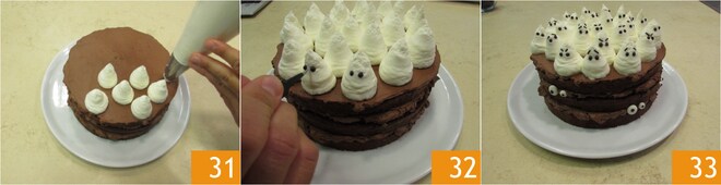 Forme os fantasminhas, espremendo pitangas na superfície do bolo 31 e decore-os com granulado e confeitos de chocolate para criar olhos e sobrancelhas 32. Coloque o seu bolo fantasma na geladeira até a hora de servir 33!