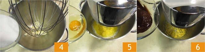 Adicione o açúcar 4, uma pitada de sal e trabalhe com a batedeira elétrica até obter uma mistura macia e cremosa. Adicione 2 dos 4 ovos 5 e continue trabalhando até a completa absorção. Junte também o chocolate derretido 6 e misture a mistura com a batedeira.
