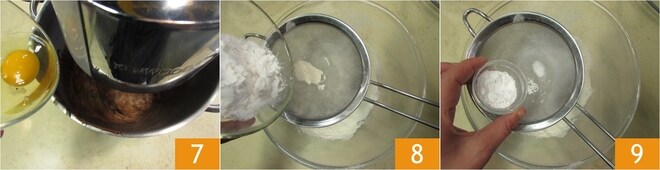 Continue adicionando os ovos restantes 7, mexendo sempre com a batedeira até a completa absorção. Neste ponto, peneire dentro de uma tigela a farinha 8, o amido de batata e o fermento 9.