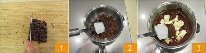 Para preparar o bolo fofinho de chocolate, primeiro comece picando o chocolate amargo 1. Derreta-o em banho-maria 2, depois adicione a manteiga em cubos e mexa até que esteja derretida 3. Se preferir, essa operação pode ser feita no micro-ondas, ligando-o 30 segundos de cada vez e mexendo com uma espátula. Deixe de lado para esfriar um pouco.