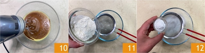 Mexa até que esteja bem absorvido. Peneire em uma tigela as farinhas: farinha de trigo, fécula de batata 11 e fermento 12.