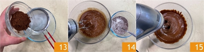 Peneire também o cacau 13. Volte a ligar a batedeira em velocidade moderada e adicione as farinhas aos poucos 14; mexa até obter uma mistura homogênea 15.