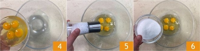 Enquanto isso, coloque os ovos em temperatura ambiente em uma tigela 4; adicione uma pitada de sal 5 e o açúcar 6.