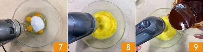 Trabalhe com a batedeira 7 até obter uma mistura clara e espumosa 8. Agora com a batedeira ligada, adicione aos poucos a mistura de manteiga e chocolate já morna 9.