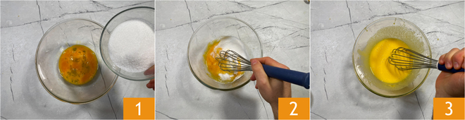 Para preparar o plumcake bicolor comece quebrando os ovos numa tigela, adicione o açúcar 1 e bata à mão com um batedor 2 por 5 minutos 3.
