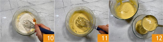 Misture delicadamente com o batedor manual 10 até obter uma massa homogênea 11. A este ponto transfira para outra tigela 300 g da massa recém-preparada 12.
