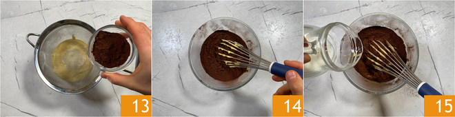 Ainda nessa tigela, adicione o cacau amargo peneirado 13 e misture com o batedor 14, despeje o leite em fio 15. Misture bem.
