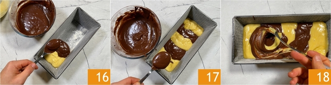 Unte e enfarinhe uma forma de 23x11 cm, com 7,5 cm de altura. Despeje 3 colheres da massa clara alternadas com 2 da de cacau 16. Depois faça uma segunda camada, começando desta vez pela massa de cacau e alternando 3 colheres da massa escura com 2 colheres da massa clara 17. Uma vez terminada a massa, faça o efeito marmorizado com um garfo, movendo-se do fundo para cima, misturando delicadamente 18.