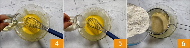 Junte o óleo em fio enquanto continua a mexer com o batedor 4. Adicione também o leite em fio 5 e depois peneire a farinha dentro 6.