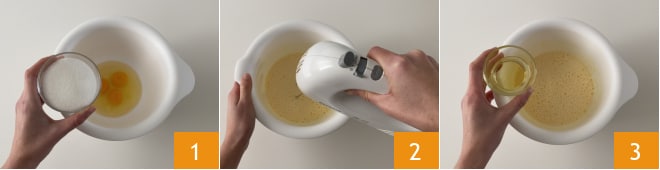 Para preparar o bolo café e leite, prepare o café com a moka na quantidade necessária. Em uma tigela, bata os ovos e o açúcar 1 com uma batedeira elétrica 2 até obter uma mistura clara e espumosa. Adicione o óleo 3