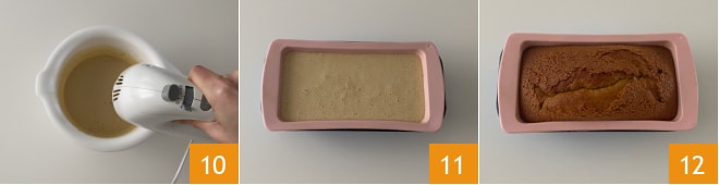 Bata todos os ingredientes, ainda com a batedeira, até obter uma massa homogênea e sem grumos: ficará bastante líquida 10. Transfira a mistura para uma forma de 22x12 cm. Usamos uma de silicone, mas se preferir usar uma forma clássica, recomendamos untá-la e enfarinhá-la antes de despejar a mistura. Asse o bolo em forno estático pré-aquecido a 180° por 40-45 minutos. Antes de retirá-lo do forno, faça o teste do palito para certificar-se de que o bolo está bem assado por dentro. Assim que tirar do forno 12, deixe esfriar um pouco.